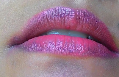 Elle 18 Color Boost Lipstick in Hollywood Pink comes in a cute neon pink cap with a black base. Lipstick has a dual-core format with an orange-colored center which is tinted as well. Packaging is sturdy and shuts tight, so no need to worry and toss without thinking into the purse. Details about shade are printed on the back of the lipstick.