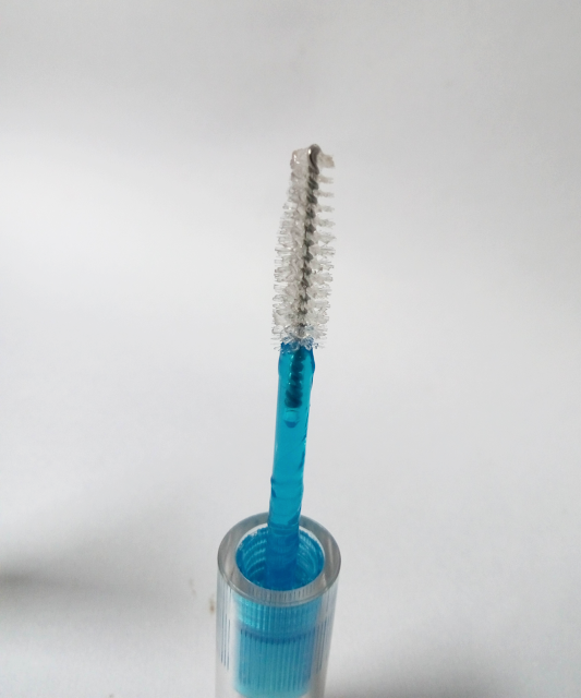 This transparent mascara comes in a transparent plastic packaging so the product and quantity is very much visible. Wand is transparent too and bristles look basic.
