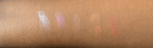 It has 5 shades from top; first one is a pink champagne color, second one is a pink color, third one is muted orange with pink undertones, fourth one is an orangish gold and fifth, the last one is reddish coral shade which is very flattering. All these shades are hell pigmented and shimmery!